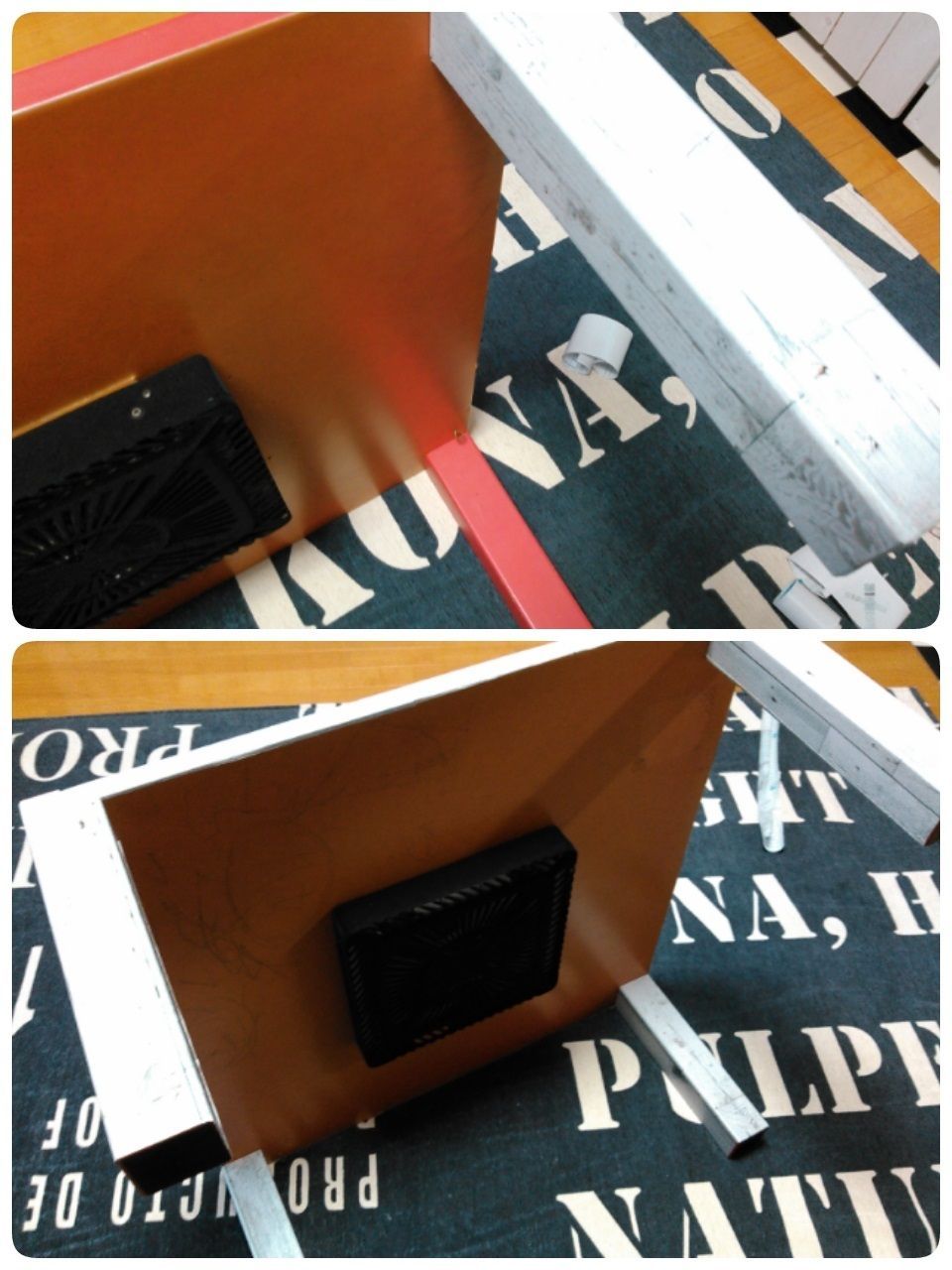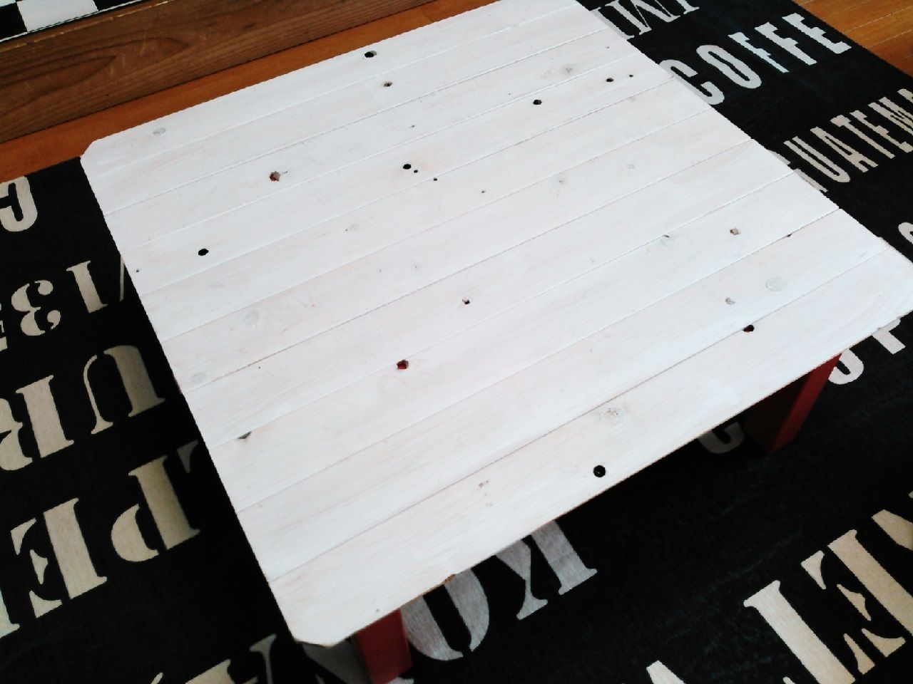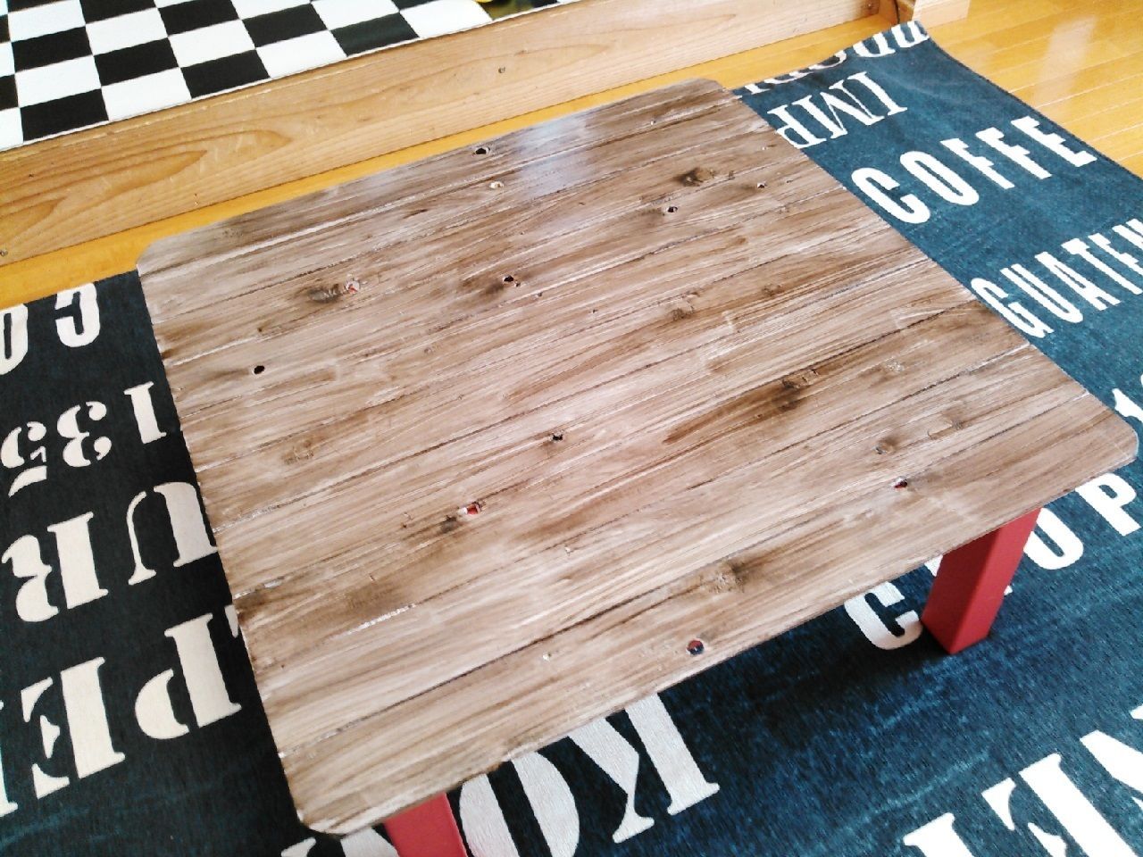 天板に被せてみるといい感じです^^これで天板は完成なのですが、こたつの足の「赤」が気になったので、足もリメイクすることにしました↓