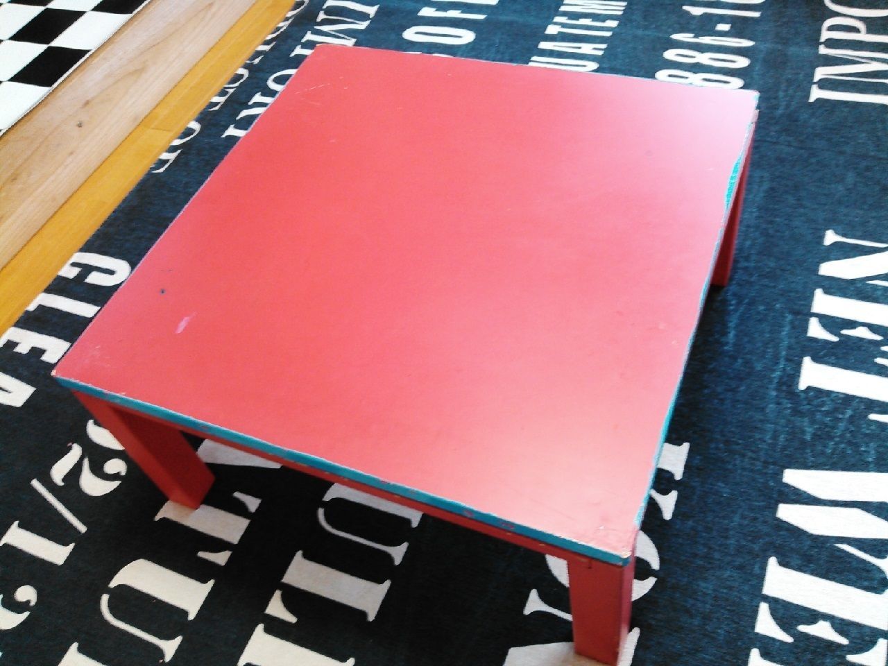 もう15年ほど前のこたつですが、当時は真っ赤が欲しくてウキウキしながら買った事を思い出しました^^;買って間もなく天板の裏を水色に塗りリバーシブルで使っていたことも思い出しました^^なので、縁が水色丸出しです^^;