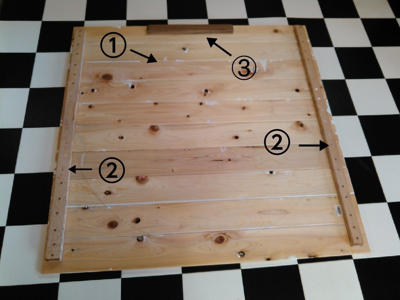 このままでも良かったのですが、支え木の余りがあったので、写真③のところにもつけました。これをつけることで、天板がずれないようにストッパーの代わりになります。