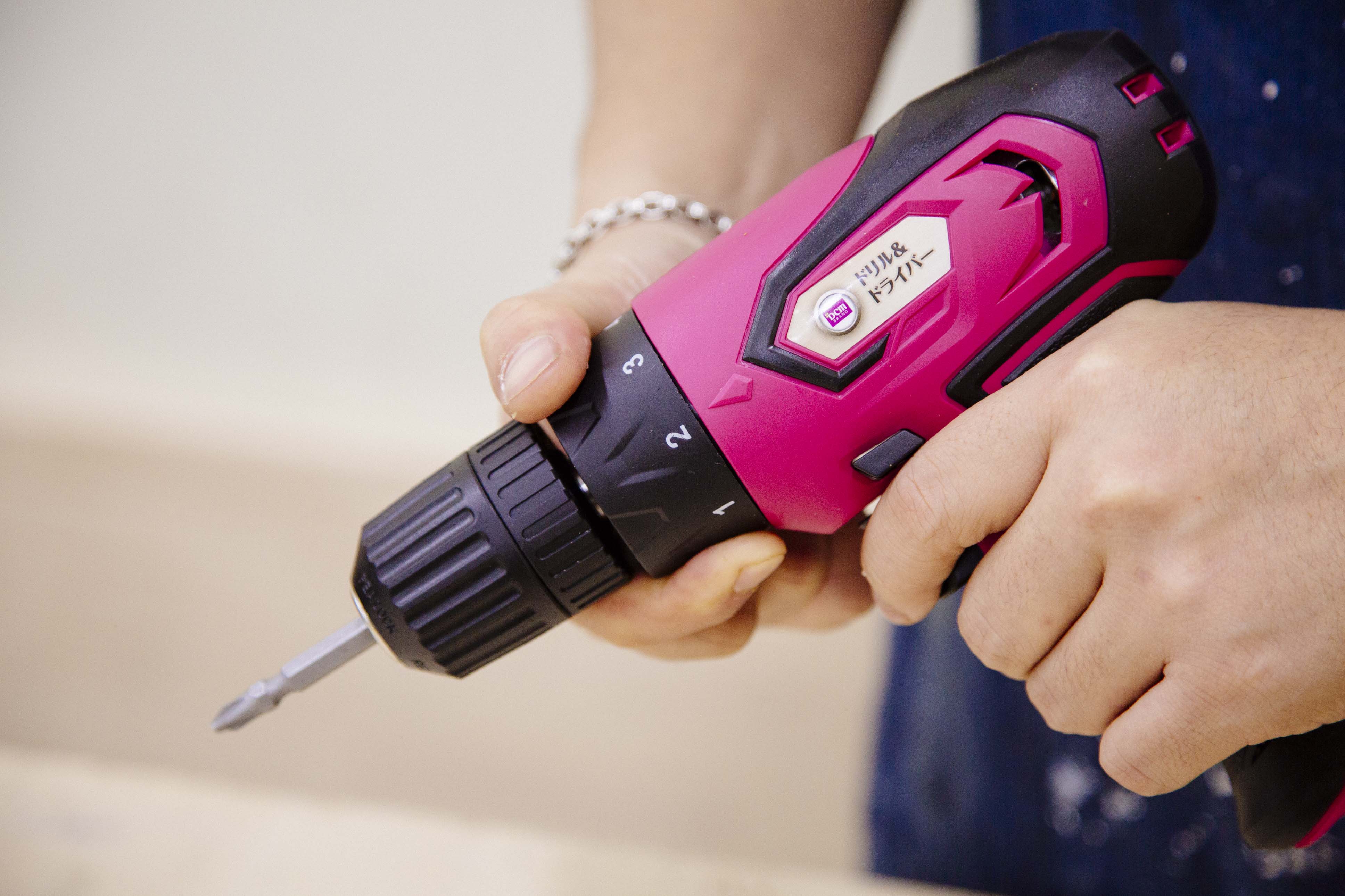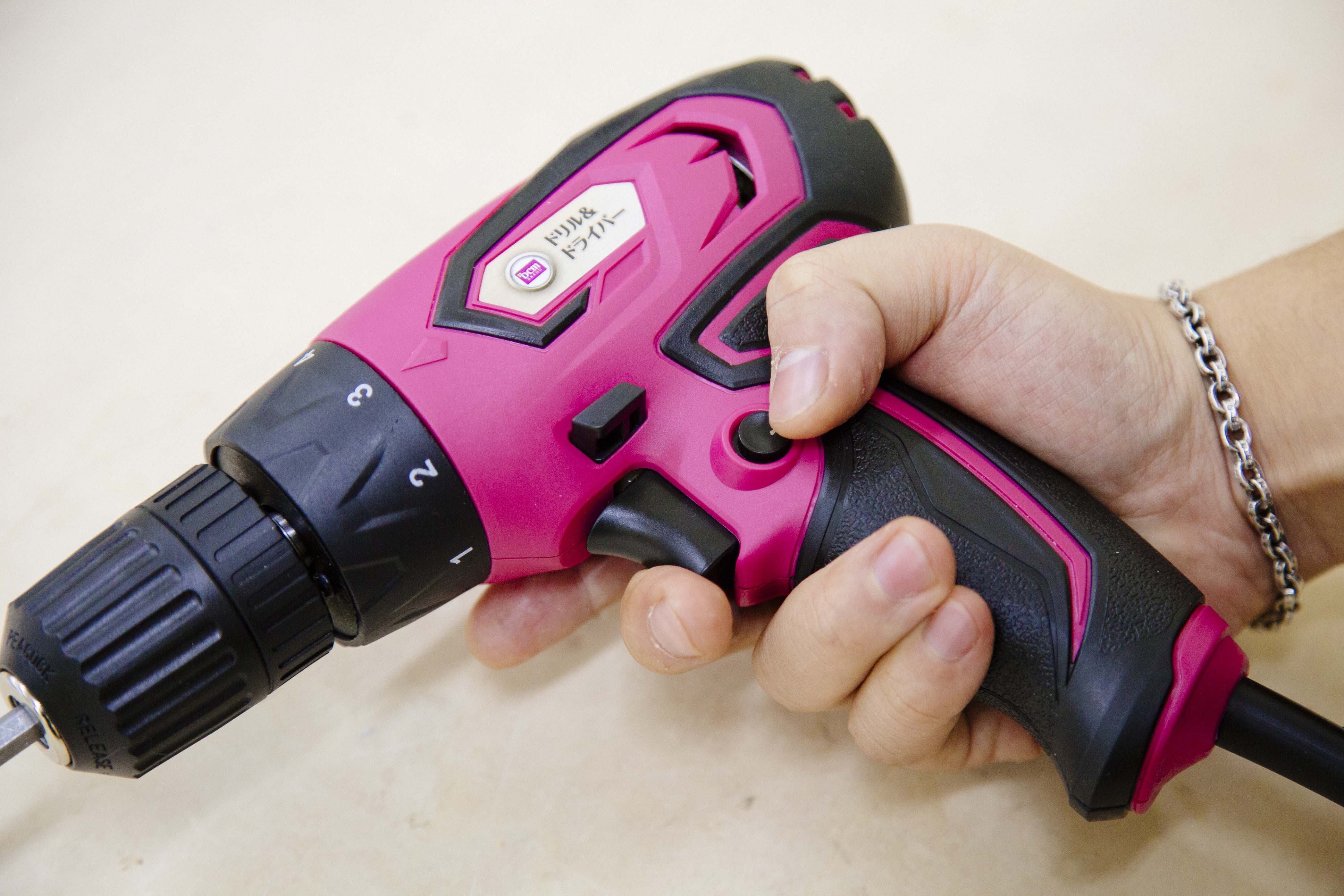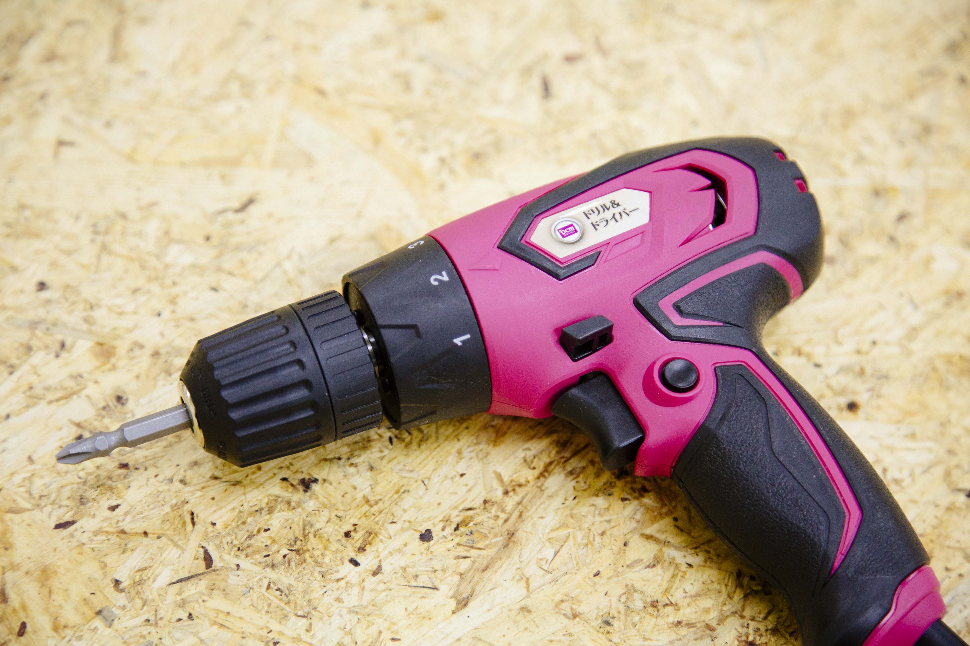 こちらがDCMブランドから発売している、『ドリル&ドライバー』。回転を利用してネジの締め付け&ゆるめ、さらに木材などへの穴あけが可能な電動ツール。トリガーを引くだけで回転がスタート&ストップするので、誰でも簡単に取り扱うことができますよ。