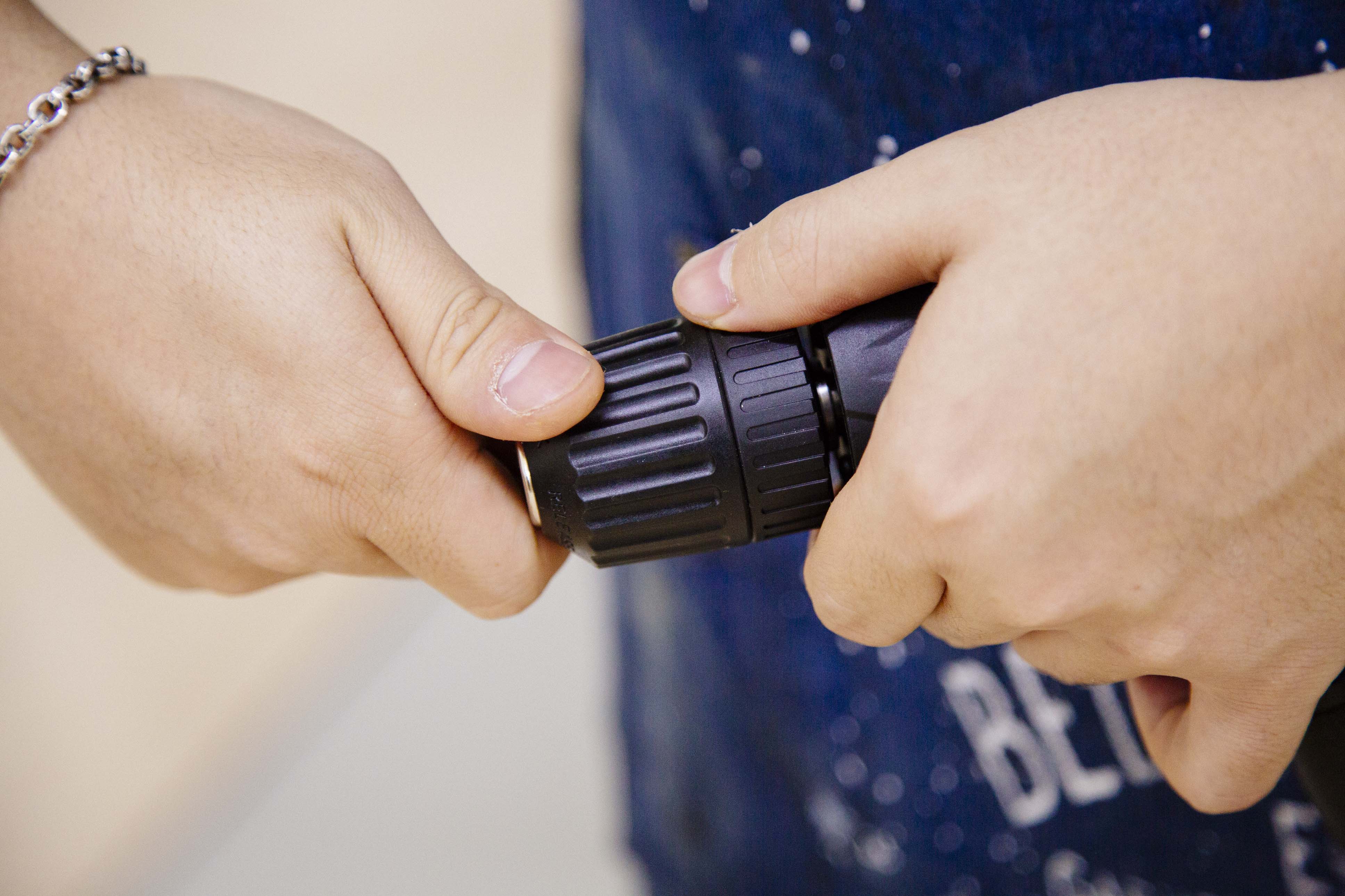 ネジ止め作業に入る前に、簡単にドリル&ドライバーの使い方をご紹介。チャックと呼ばれる、ドライバーを固定する先端のパーツをゆるめます。