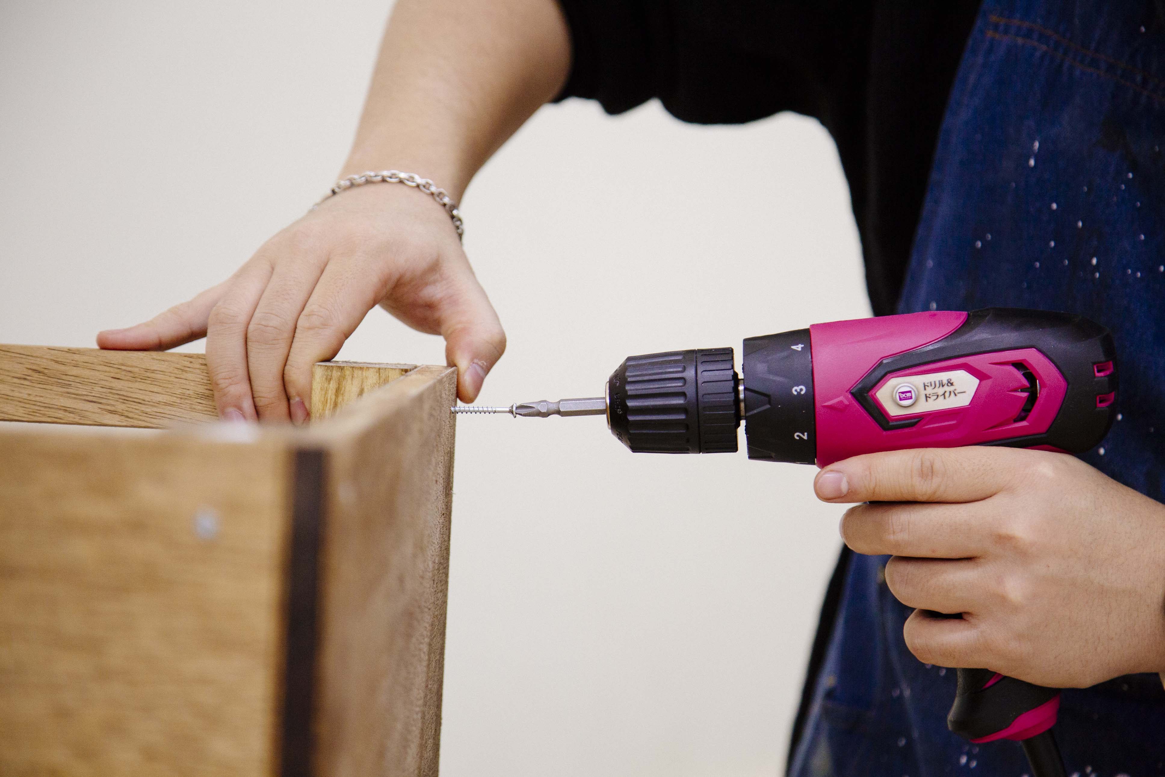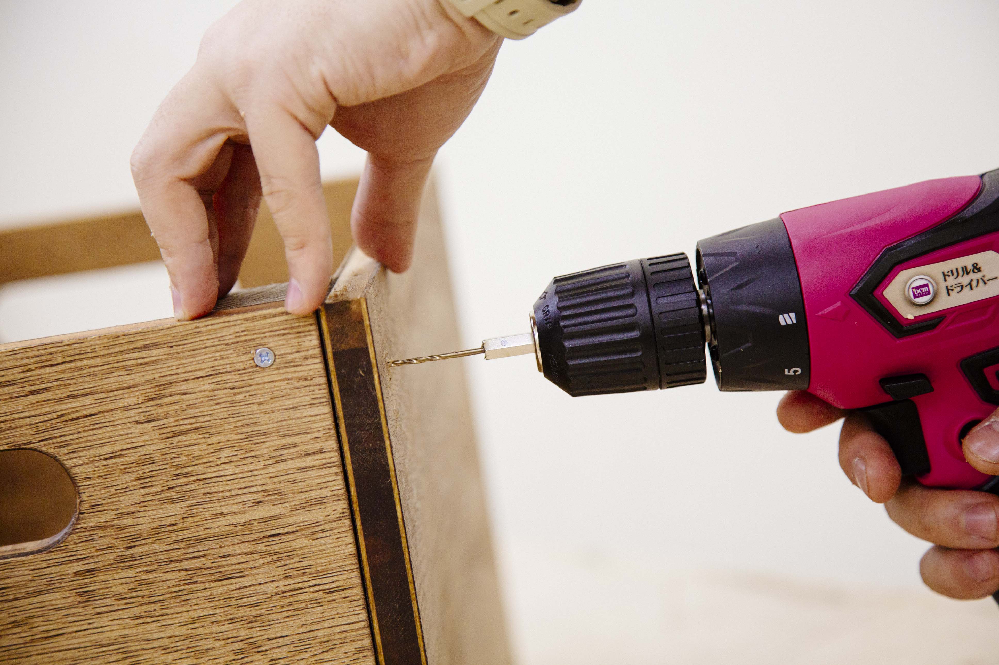 下穴を開けた場所のネジ止めを行います。下穴を開けたおかげで非常にスムーズ。回転数が足りないなと感じる方はダイヤルを3に設定すると快適に作業できます。