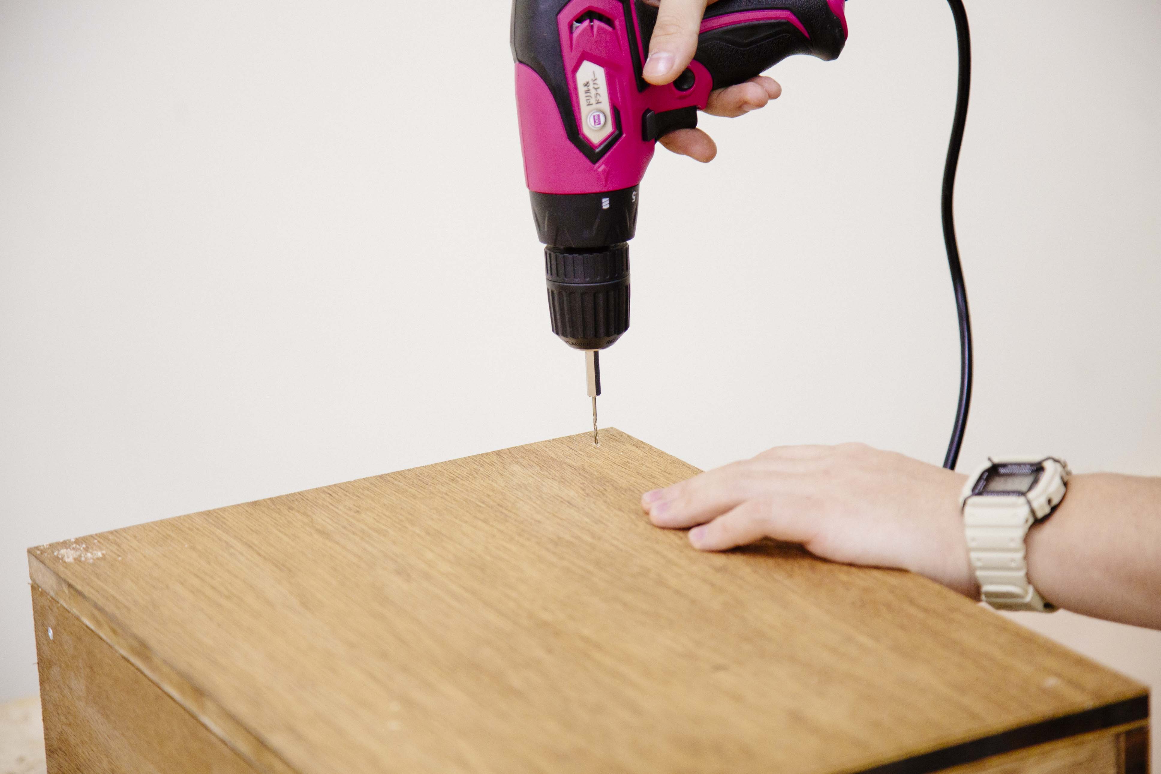 それぞれの木材の四隅へネジ止めを行う前に重要なステップが、ドリルビットを使って下穴を開けること。先に下穴を開けることで、ネジがスムーズに木材に入っていき、板が割れてしまったり、斜めにネジが止まることを防いでくれます。この作業の際はダイヤルを写真のように穴開け用に設定しましょう。また、2x2材を仮止めしているため、ネジ止めする場所は2x2材の幅内で行えばどこでもOKです。