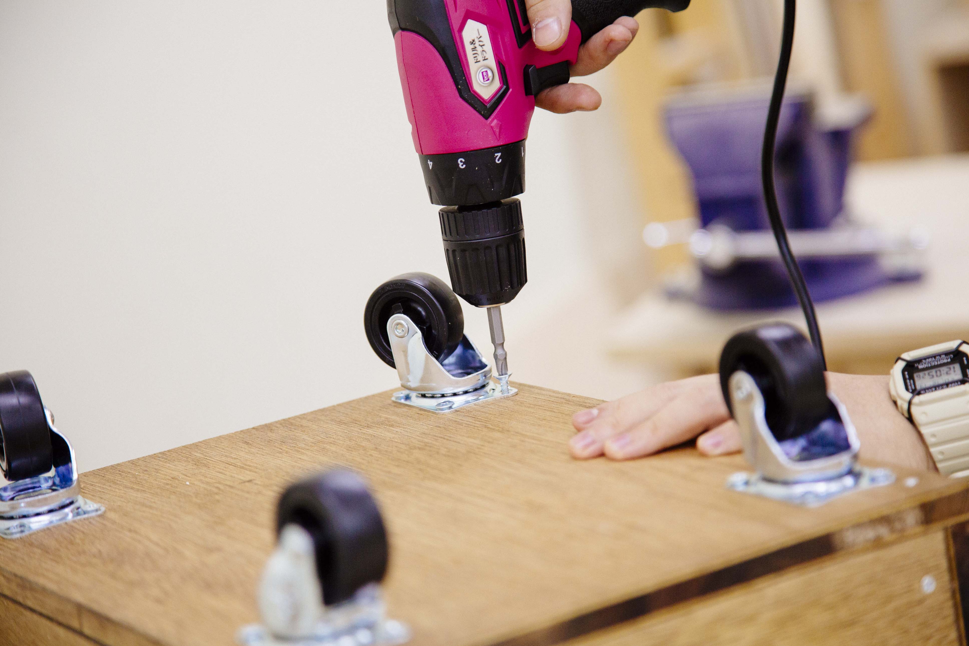 底板の固定が完了したら、キャスターを取り付けましょう。これで完成です!終わってから振り返ると、電動工具でありがちな大きな作業音が少ない印象を受けました。