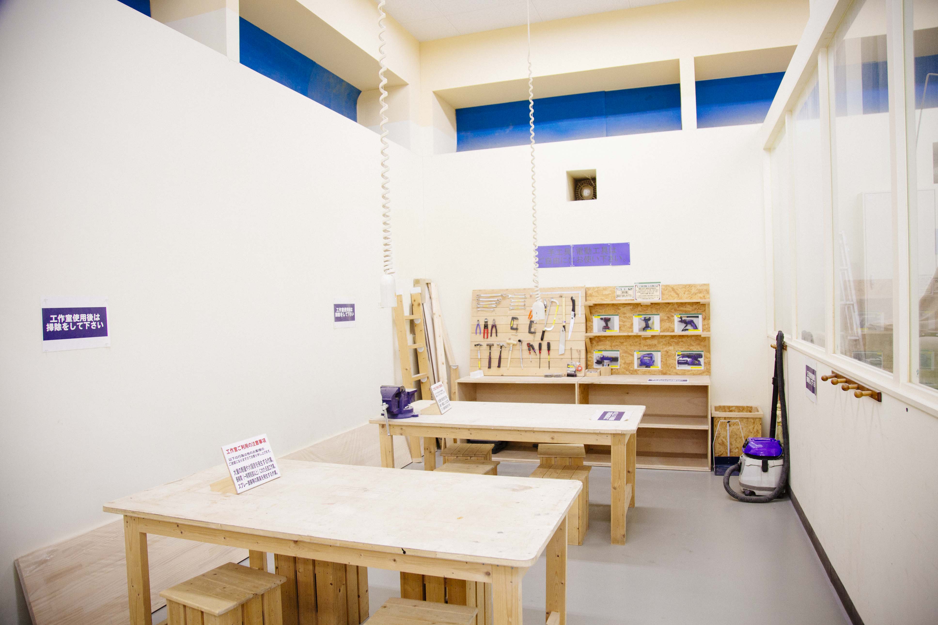 店内に構えたお客様用のDIYスペース。購入した木材のカットやかんたんなDIYであれば、こちらで作業可能です。