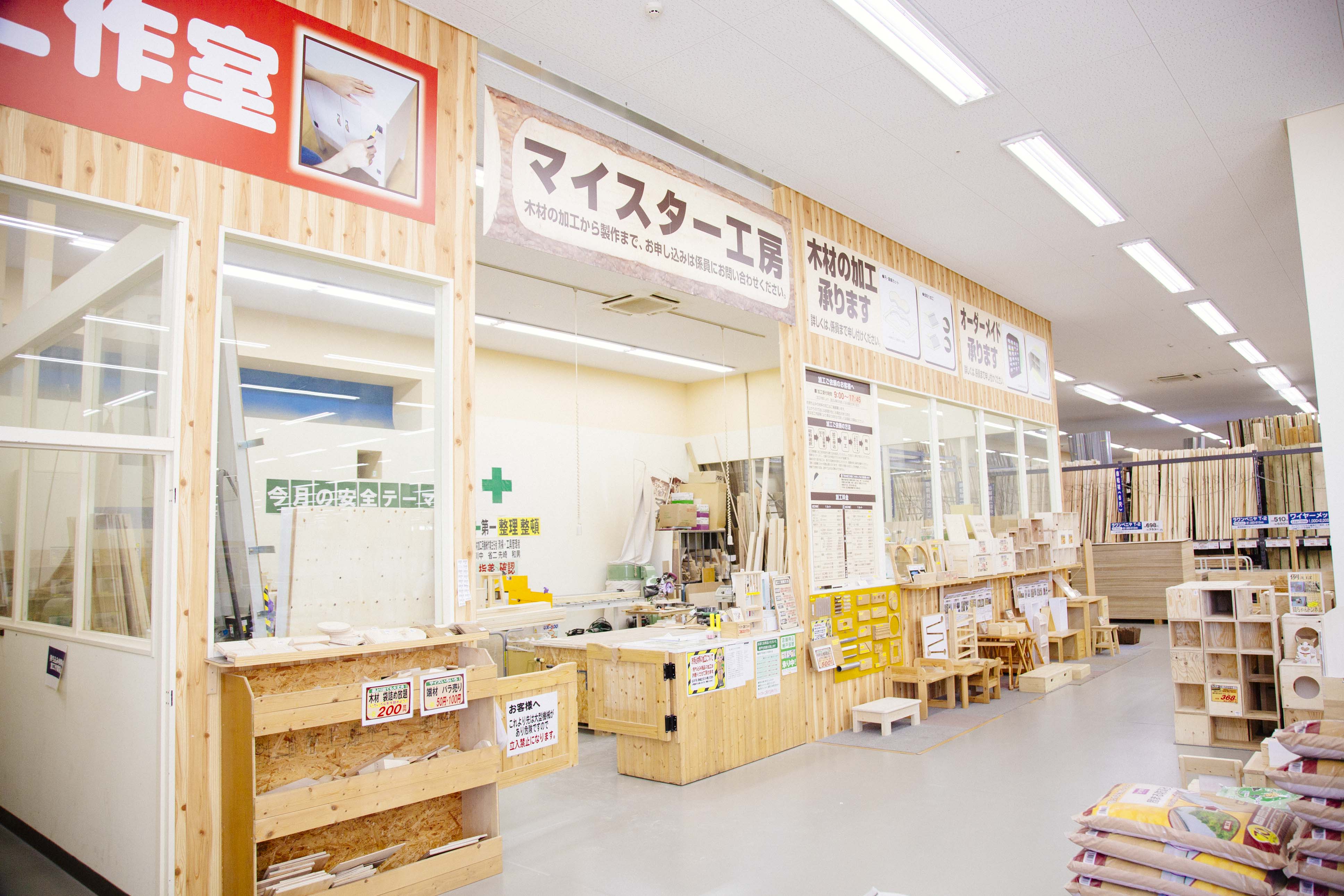 木材はすべて店内で購入可能。マイスター工房でカットの加工を依頼すれば、事前準備も簡単!