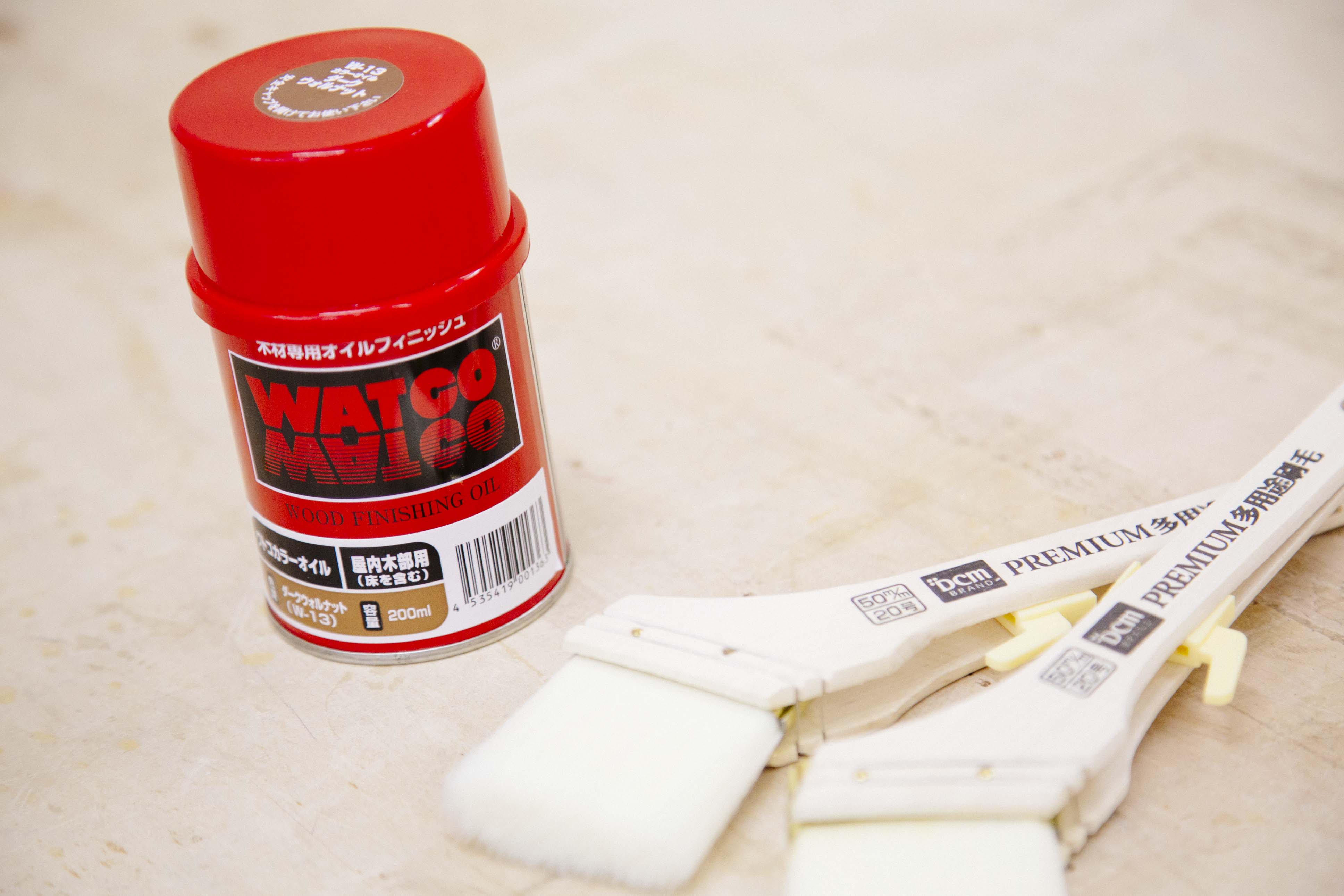 また、木材に風合いを出すため、事前に色を塗っていきます。今回は「ワトコオイル」シリーズを使用。DIYのクオリティをグッと高めてくれる、味わい深い色合いを出してくれます。無塗装のままが好みの方は、塗装は行わなくても問題ありません。