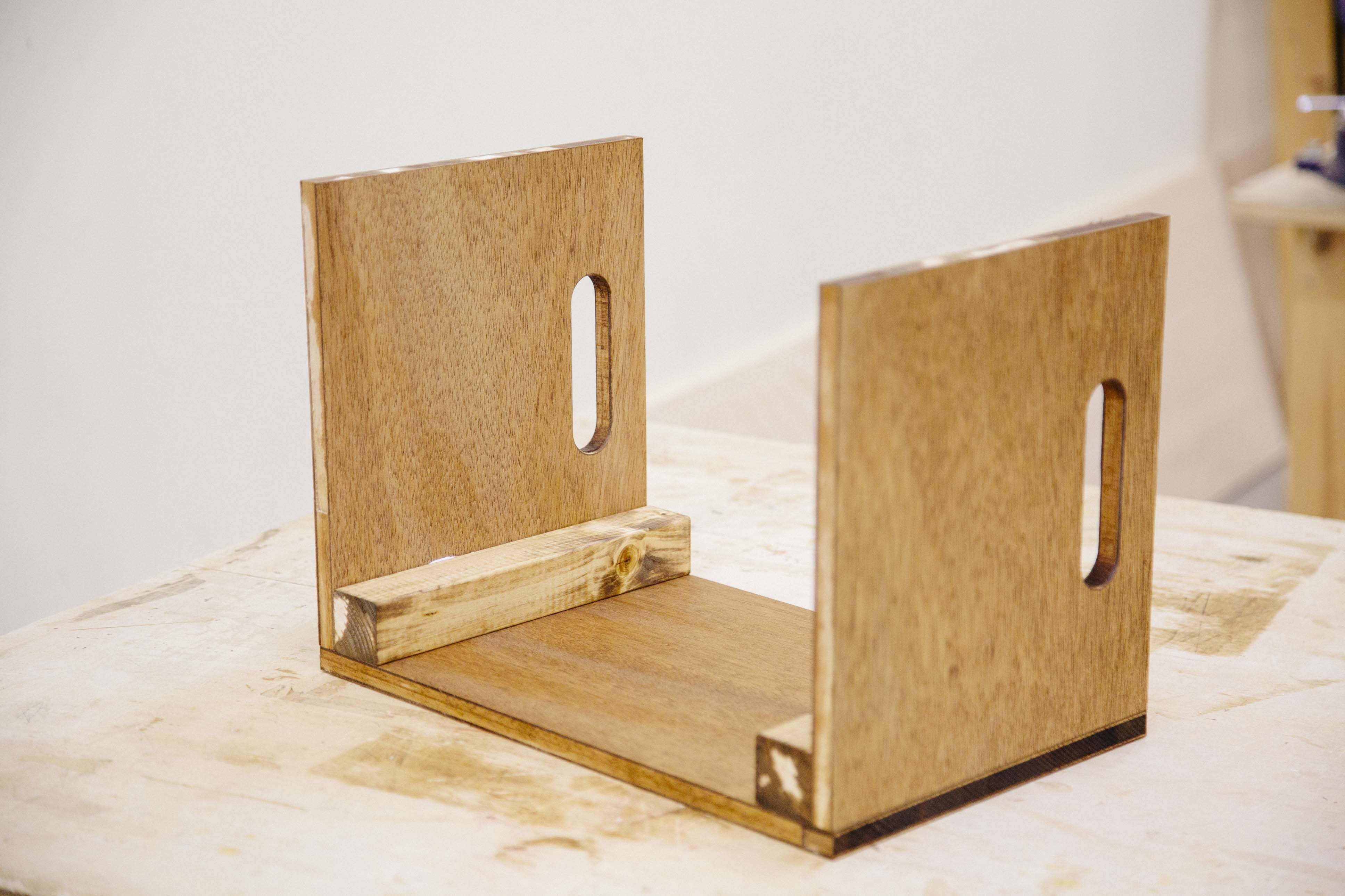 作りたいボックスをイメージしながら、木工用接着剤を使って、木材A、B、2x2材をそれぞれ所定の位置で仮止めします。