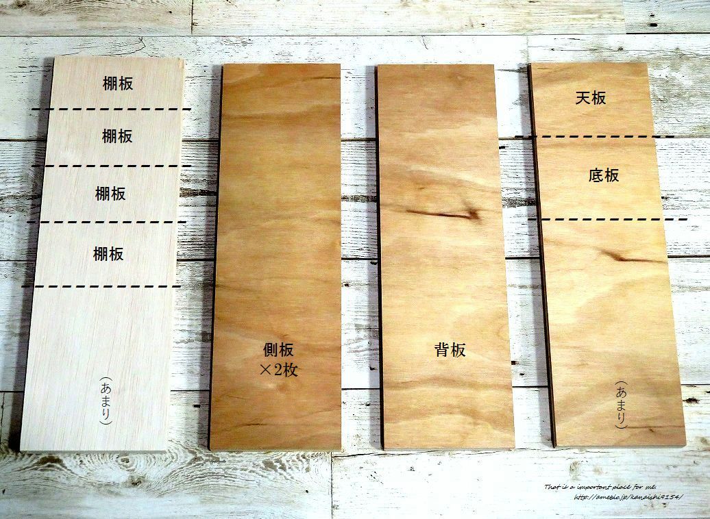 - 合板53cm×39cm(厚さ9mm)を下記サイズにカットして使用。