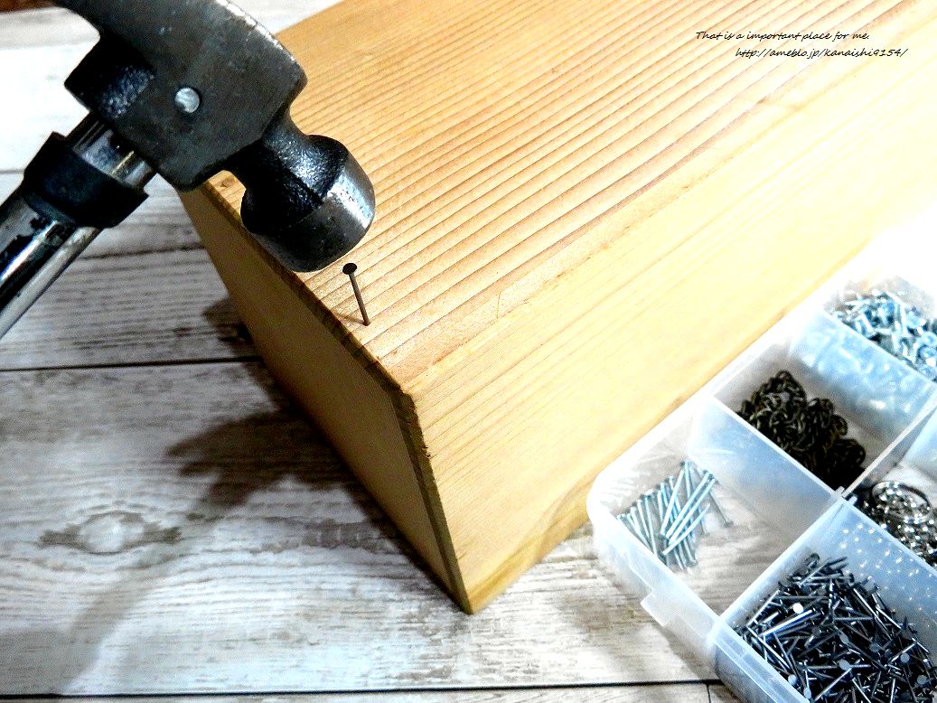 この時の注意点として、釘は端に打つのではなくふちから1~2cmほど中に入った所から打ち始め、そこを始点に追加で2~3箇所打つようにしました。