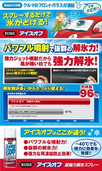 クルマのウィンドウに付いた氷や霜をすばやく溶かし再凍結も防止する、強力解氷剤