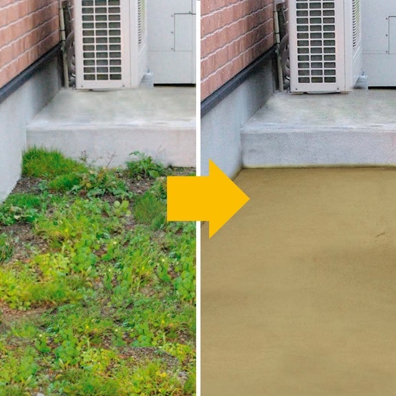 雑草を取り除いた後に地ならしし、防草砂を敷き詰めまんべんなく水を撒いておくと約24時間で固まり、雑草の発生を抑止します。