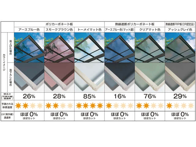 骨組みはアルミで、屋根はポリカーボネート板と熱線遮断ポリカーボネート板から選択できます。