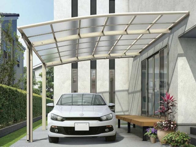 積雪20cm~30cmの場合、片側支持(正面から見て柱が片側にあるタイプ)で、ポリカーボネート屋根が一般的です。