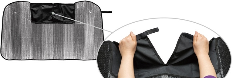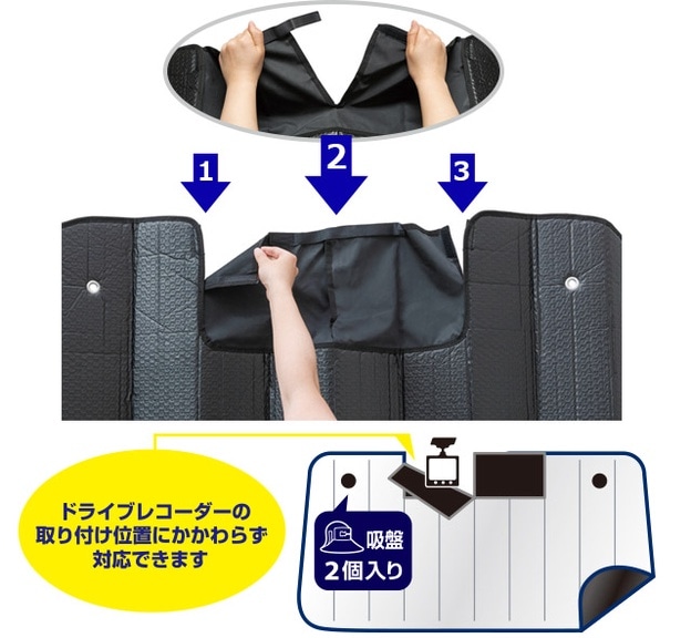 DCMドライブレコーダー対応の車用サンシェードは、上部の切り込み部分を幅広く設け、切り込みを3か所作ることにより、取り付け位置にかかわらずドライブレコーダーをよけて設置できます。