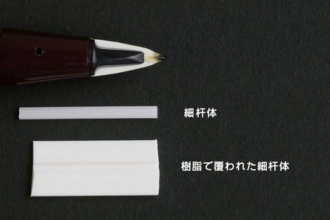 その「細杆体」をさらに拡大すると、断面は細い棒状のものがたくさん束ねられたようになっている。これら一本一本の棒の間にはわずかにすき間があり、そこからインクが流れ出てくる。この「細杆体」は2mmくらいの厚みしかないので、これ単体でペン先とするにはさすがに強度が弱い。そこで、樹脂製の平らなパーツで「細杆体」をコーティングするように覆っている。それを「プラマン」のペン先にあるような矢印型に打ち抜いていく。