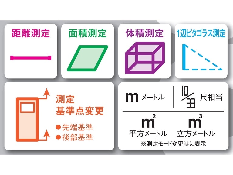 ・距離測定・面積測定・体積測定・ピタゴラス測定・測定基準点変更など、様々な測定が可能です。