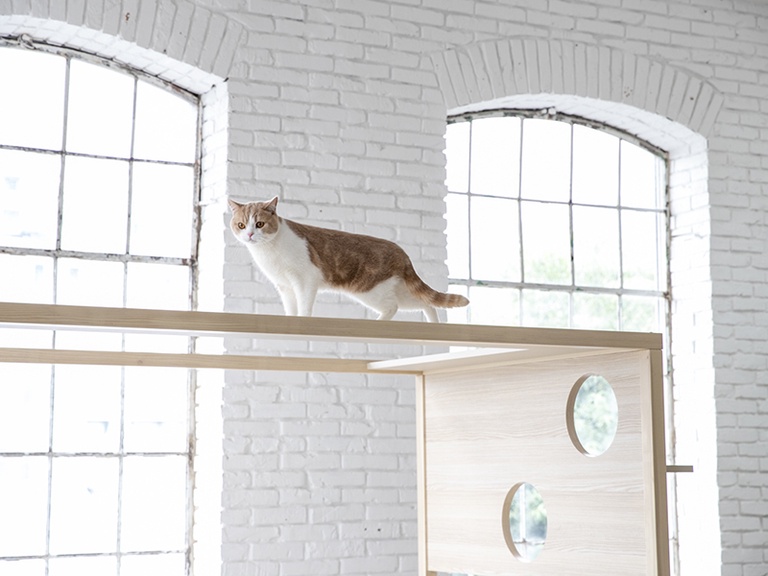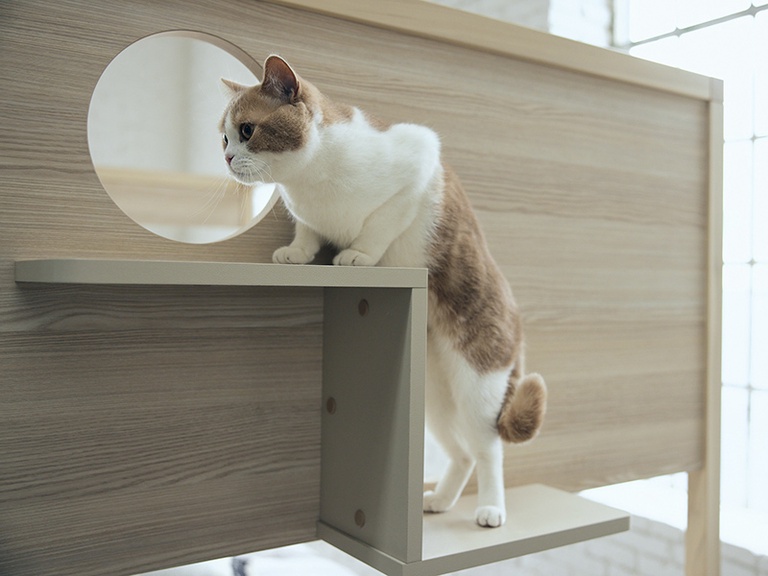 いっぱい遊んで疲れたら、自分だけの空間でのんびり。そんなネコちゃんの姿を眺められる。飼い主さんとネコちゃんが一緒に使う楽しいベッドフレームです。