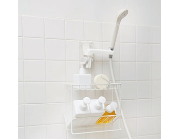 バスグッズはを床置きせずコンパクトに収納。シャワーヘッドに差し込むだけで使えます。180度の回転ヘッド。