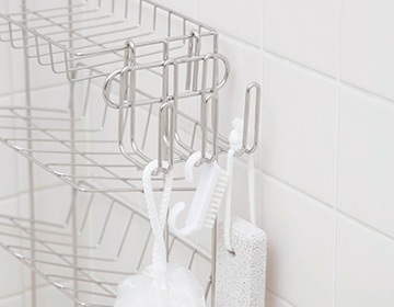 お風呂で使う小物も、ホルダーやフックを使えばすっきり収納できます。