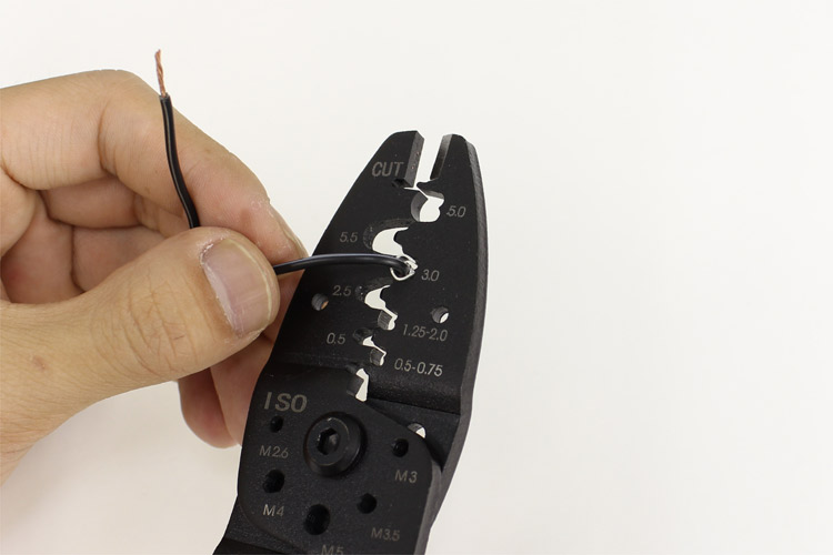 電工ペンチの3.0の箇所で、まず軽くはさんで、ツメを被覆部にホールドさせます。(仮かしめ)