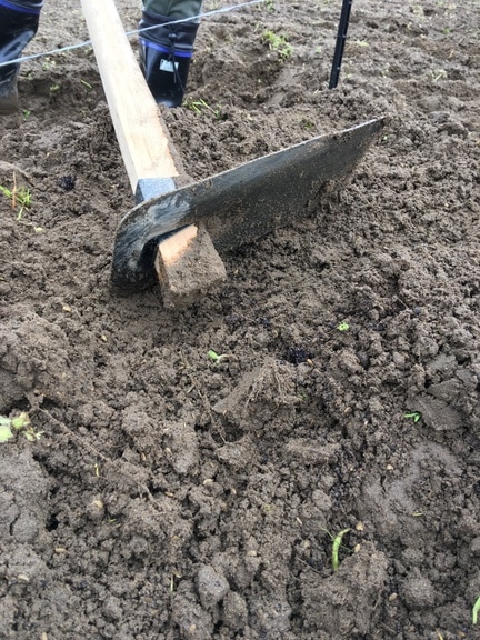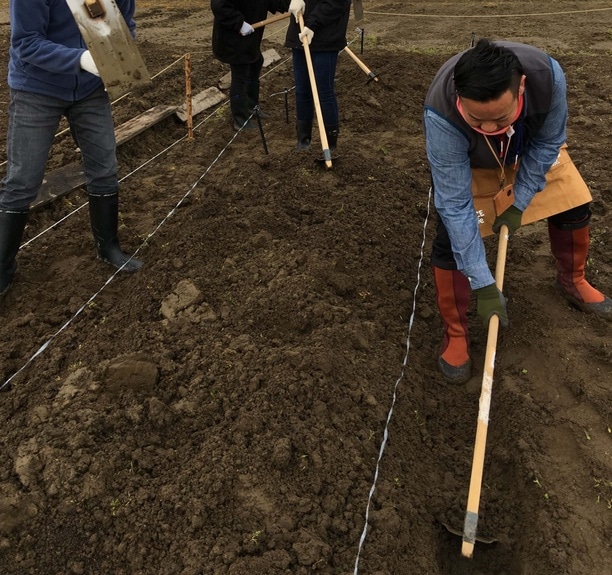 次に耕作鍬やコンパクト耕作鍬で線の外側の土を内側に入れて土を盛り上げていきます。