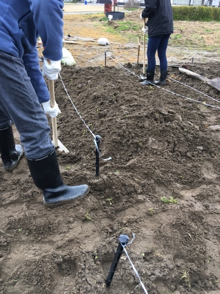 菜園プランに合わせて畝づくりの目印をつけます。