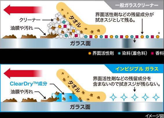 独自のClearDryTM成分が油膜や頑固な汚れをすばやく取り除き、ギラつきのない驚くほどきれいなガラスに仕上げるガラス用洗浄剤です。<br>拭きスジが一切なく、洗浄成分が残ることもありません。