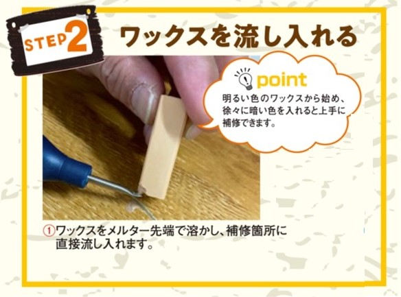 ①ワックスをメルター先端で溶かし、補修箇所に直接流し入れます。