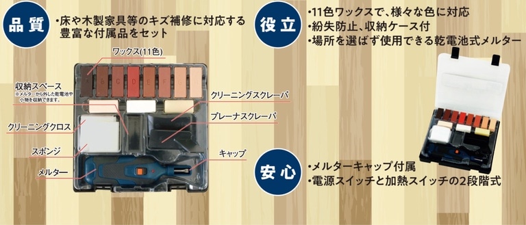 床や木製家具等のキズ補修に対応する豊富な付属品を集めた補修セット「床補修セットFRS-11」を使って床の補修をしよう!