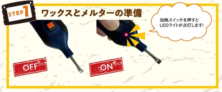 加熱スイッチを押している間のみ加熱されます。ワックスを溶かす温度にするため、あらかじめ加熱しておきましょう。