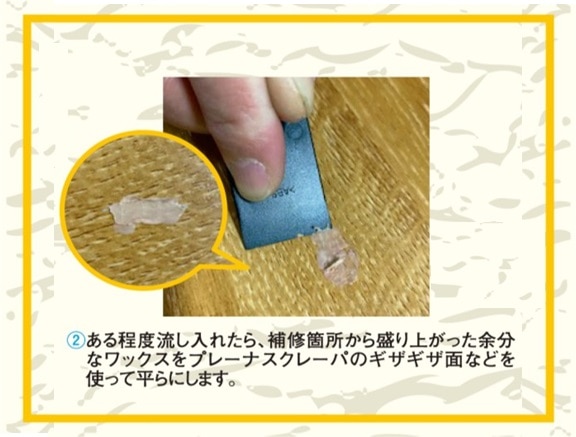 ②ある程度流し入れたら、補修箇所から盛り上がった余分なワックスをプレーナスクレーバのギザギザ面などを使って平らにします。