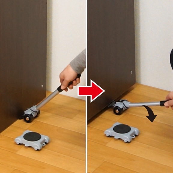 使い方はとっても簡単!動かしたい家具にリフターの先を差し込みハンドルを下げると、てこの原理でラクラク持ち上がります。