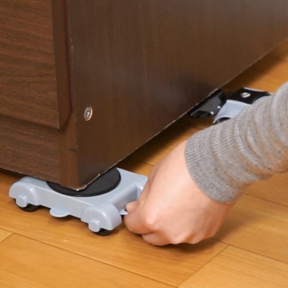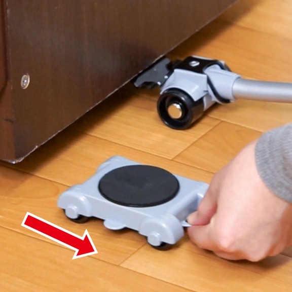 持ち上げて空いた隙間に台車をセットします。台車には8つのローラーが付いているので、安定してスムーズに移動することができます。