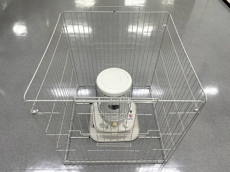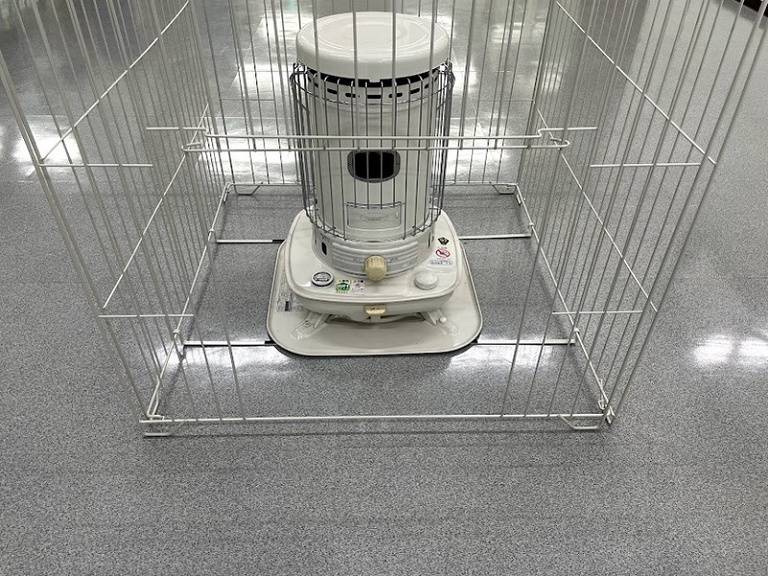 ①ストーブの下皿の幅に固定金具を合わせ、その上にストーブを置いてください。