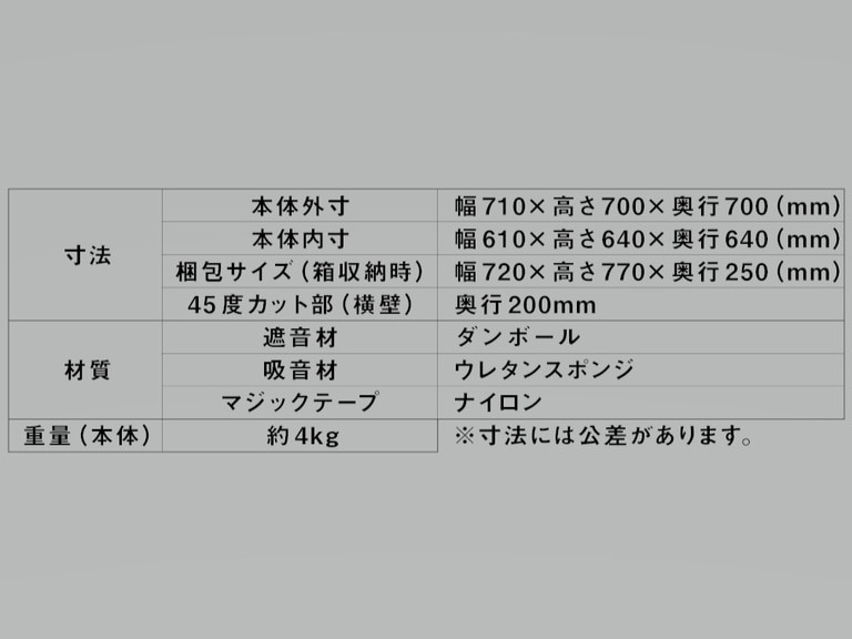 ●必ず音源を本体で囲うように置いてください。音源を本体の奥の方へ入れるほど防音効果は高くなります。●本商品は騒音や音漏れを減少させる目的の商品です。完全に無くすことはできません。●材質の特性上、長期のご使用により変色や変形をすることがあります。変色しただけでは防音効果が損なわれることはありません。●高温多湿な場所、湿気の多い場所、屋外、直射日光が当たる場所でのご使用、保管は避けてください。●本体が白色のため汚れが目立つ場合があります。●保管する場合、ビニール袋、外装箱に入れて直射日光の当たらない乾燥した場所にて保管してください。●開封後、臭いが気になる場合は、日陰で風にさらしていただくと低減します。臭いに敏感な方は刺激を感じることがありますので、換気をする、または休憩をとるなど、体調に留意してご使用いただくか、ご使用をお控えください。●ボックス内が暗い場合は、市販の照明スタンドなどをご使用ください。●濡らさないようにご使用ください。水拭き、水洗いもお控えください。●組み立て、折りたたみの際に強い力を加えると本体が破損する恐れがあります。●マジックテープは強く剥がすと本体を破損させる恐れがあります。ゆっくりと剥がしてください。●マジックテープが本体表面から剥がれた場合は両面テープで補修してください。●防音効果の感じ方には個人差があります。あらかじめご了承ください。●吸音材・遮音材のみの取替え、貼りかえはできません。●お子様の手の届かない場所でご使用・保管してください。●ダンボールの断面で指や手を傷つけないようご注意ください。●本体の上に物を置かないでください。●火気周辺や熱源のそばに置かないでください。●パソコンや照明スタンドなどの電気製品からの漏電、発火には十分にご注意ください。●本来の用途以外でのご使用は避けてください。●予告なしに仕様が変更する場合があります。あらかじめご了承ください。●真横への音漏れが気になる場合は本体をご自身側に近づけてご使用ください。●製造の都合、輸送条件等によりダンボールの傷や汚れ、ウレタンの多少の隙間やズレ等が生じることがありますが、防音性能が損なわれることはありません。●製造の都合上、吸音材の粘着がダンボール端面に残る場合があります。