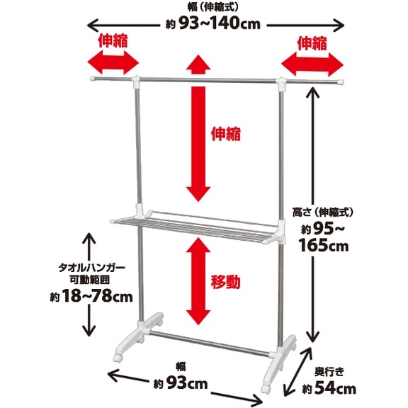 本体が伸縮するので、洗濯物を干す量に合わせて全体のサイズを変えることができます。洗濯物が少ないときには小スペース、多い時には広さを十分に使って一気に干すなど、バリエーションが選べます。※高さ(伸縮式)約95~165cm、幅(伸縮式)約93~140cm)。