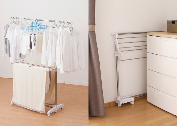 一度にシャツを10枚・バスタオルを2枚・タオルを6枚・小物32枚といった、たくさんの洗濯物が干せるステンレス製の室内物干しです。大判バスタオルも干せます。キャスターが付いているので干したまま楽に移動できます。たっぷり干せる上、キャスター部分はコンパクトにたためるため、壁と家具のすき間のような狭いスペースでも簡単に収納できて便利です。