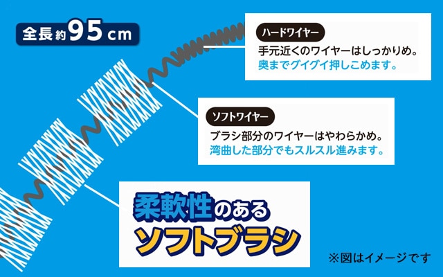 パイプの手前のお掃除には5連ブラシがオススメ。柔軟性のあるソフトブラシなのでパイプに傷をつけにくく、しっかりと汚れを落とすことができます。さらに押す力をしっかりと伝える手元のハードワイヤーがパイプに合わせてしなり、先端側のソフトワイヤーでしなやかに奥まで到達します。