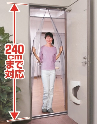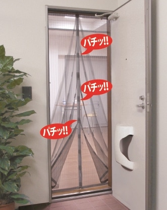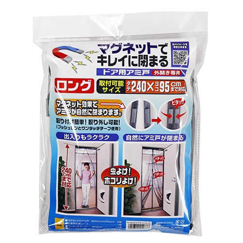 ワンタッチテープとプッシュピンでとめる玄関用アミ戸(マグネットタイプ)です。<br><br>マグネット効果でアミ戸が自然に閉まります。取り付け簡単!取り外し可能!(プッシュピンとワンタッチテープ使用)。<br>※外開きドア専用です。<br><br>2021年より『ロングサイズ』の発売を開始しました。
