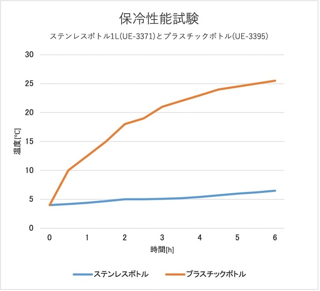 室温30℃±1℃において製品に冷水をふた栓の下端まで満たし、縦置きにした状態で水温が4℃±1℃の時から測定を開始した状態での水温の温度変化を比較。