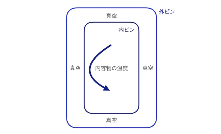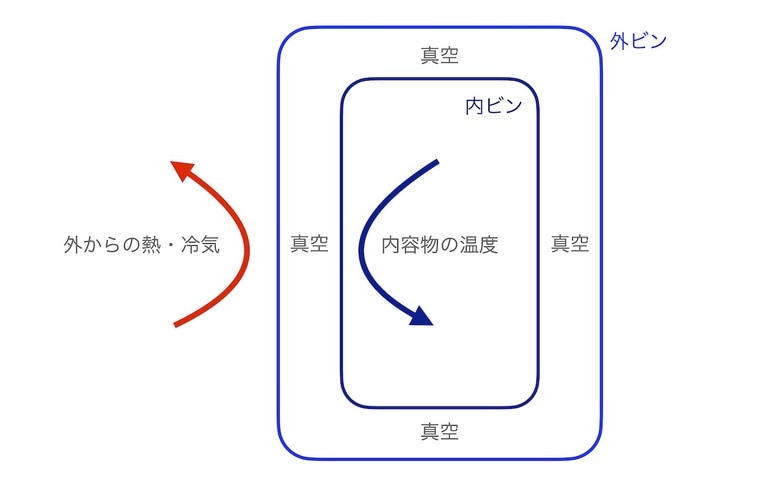 外びんと内びんの間は高真空状態になっており、熱を遮断するため伝導・対流による容器の内容物の放熱を防ぎます。