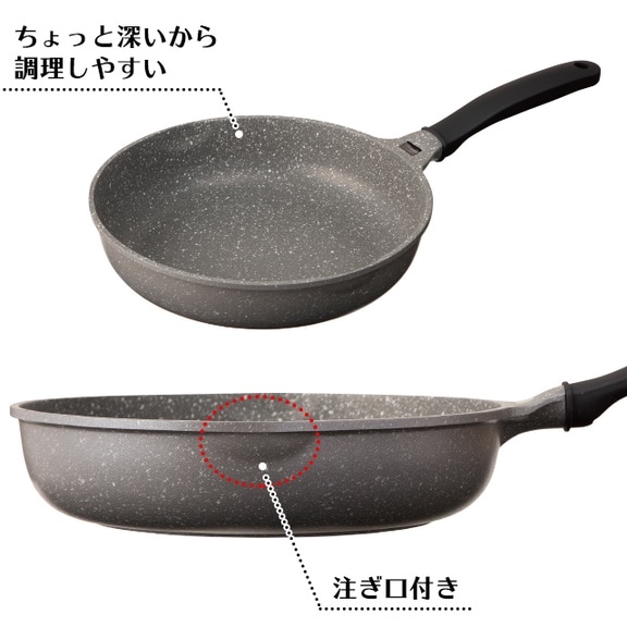 従来品より軽量化が実現し、フライパンの高さを深く設計し、より使いやすくリニューアルしました。