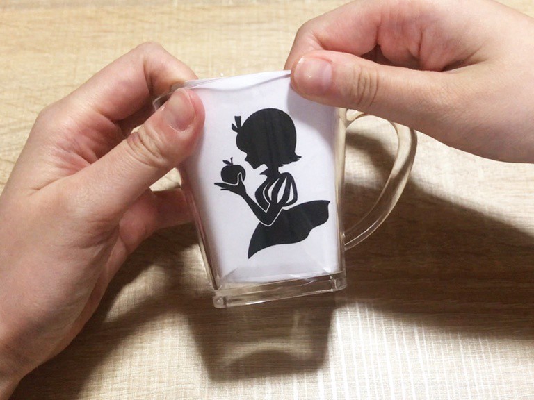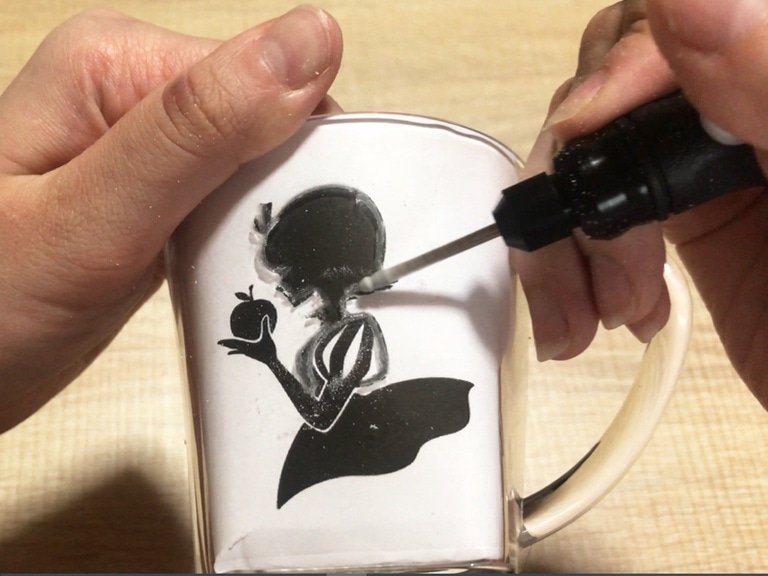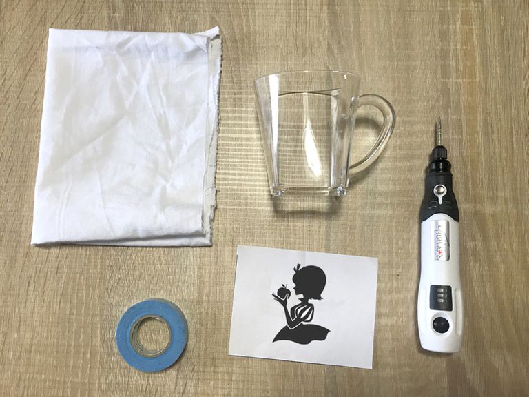 プラスチックコップの掘りたいところに下絵を入れて動かないようにマスキングテープで固定します。