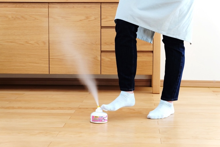 (2)カチッと音がして固定されるまでかかとを浮かし足の指で真上からゆっくりとペダルを踏むか、手で押して作動させてください。薬剤が霧状になって噴射しはじめますので、直ちに部屋から出てください。