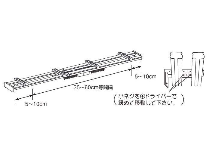 両端のブラケットはレールの端から5~10cmくらいの位置に固定し、残りのブラケットを35~60cmに1個の間隔で固定してください。