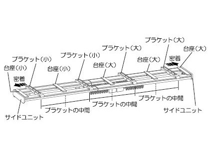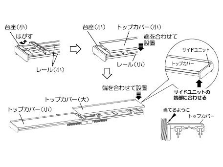 ②台座の上面に付いている両面テープの剥離しを剥がしてください。トップカバー小のシールが貼ってある方を上面に設置し、レール小端部の台座に端を合わせ、壁面に沿って設置してください。トップカバー大も同様にレール大端部に合わせて、トップカバー小の上に重ねて設置してください。