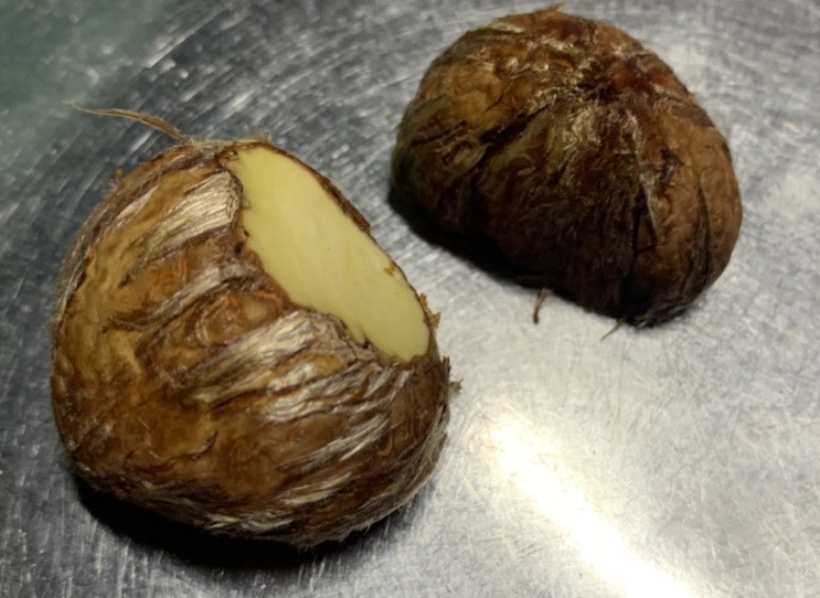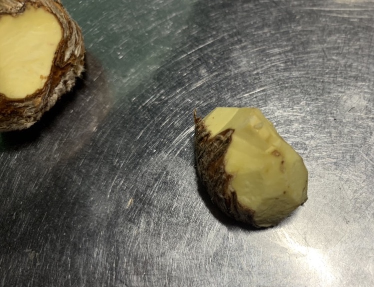 今回は包丁で地道に渋皮をむいていきます。鬼皮と違い、簡単にはむけないので気を付けてください!渋皮をむき終わったら、最後は水に浸けておくとアクが抜けて美味しく食べることができます♪