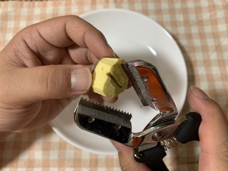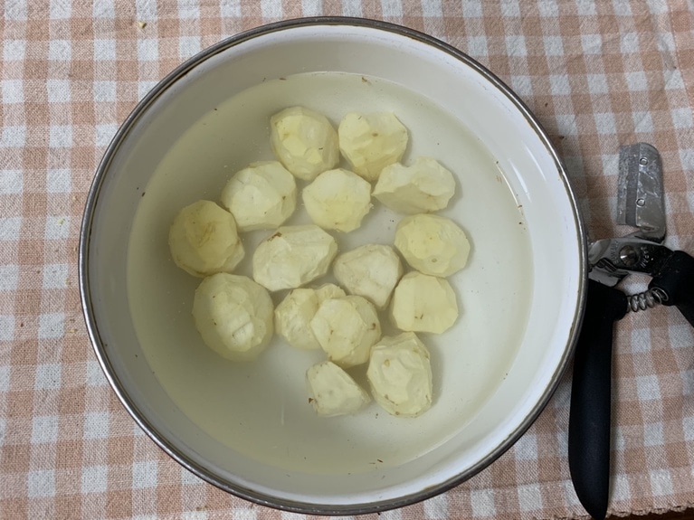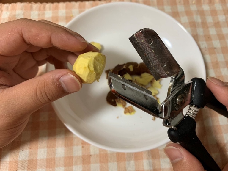 下準備としては、今回のように水かお湯に浸けておくと皮が柔らかくなり、作業がしやすいです。