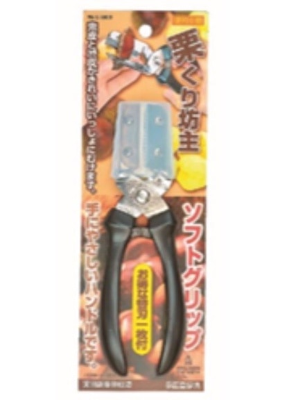 使用するアイテムがこちら!「栗くり坊主」です。名前の通り、栗の皮むきの便利アイテムです!はさみのような形をしているのですが、こちらのアイテムは刃が特徴的で片方がギザギザしていて、もう片方が鋭い刃となっています。今回はこちらを使って栗の皮むきをしていきます!